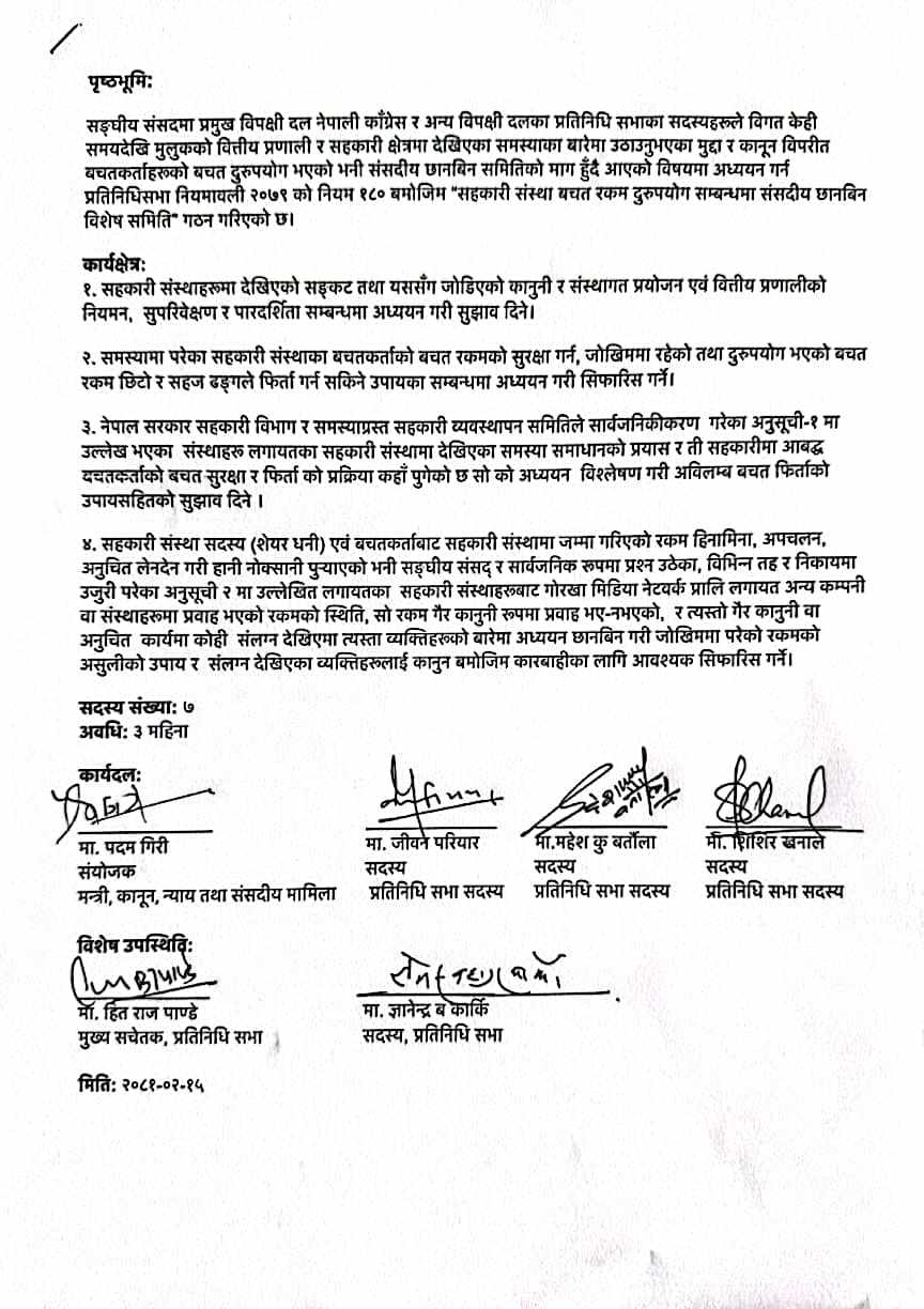 सहकारी सम्बन्धी संसदीय छानबिन समितिको कार्यादेश (टीओआर) यस्तो छ
