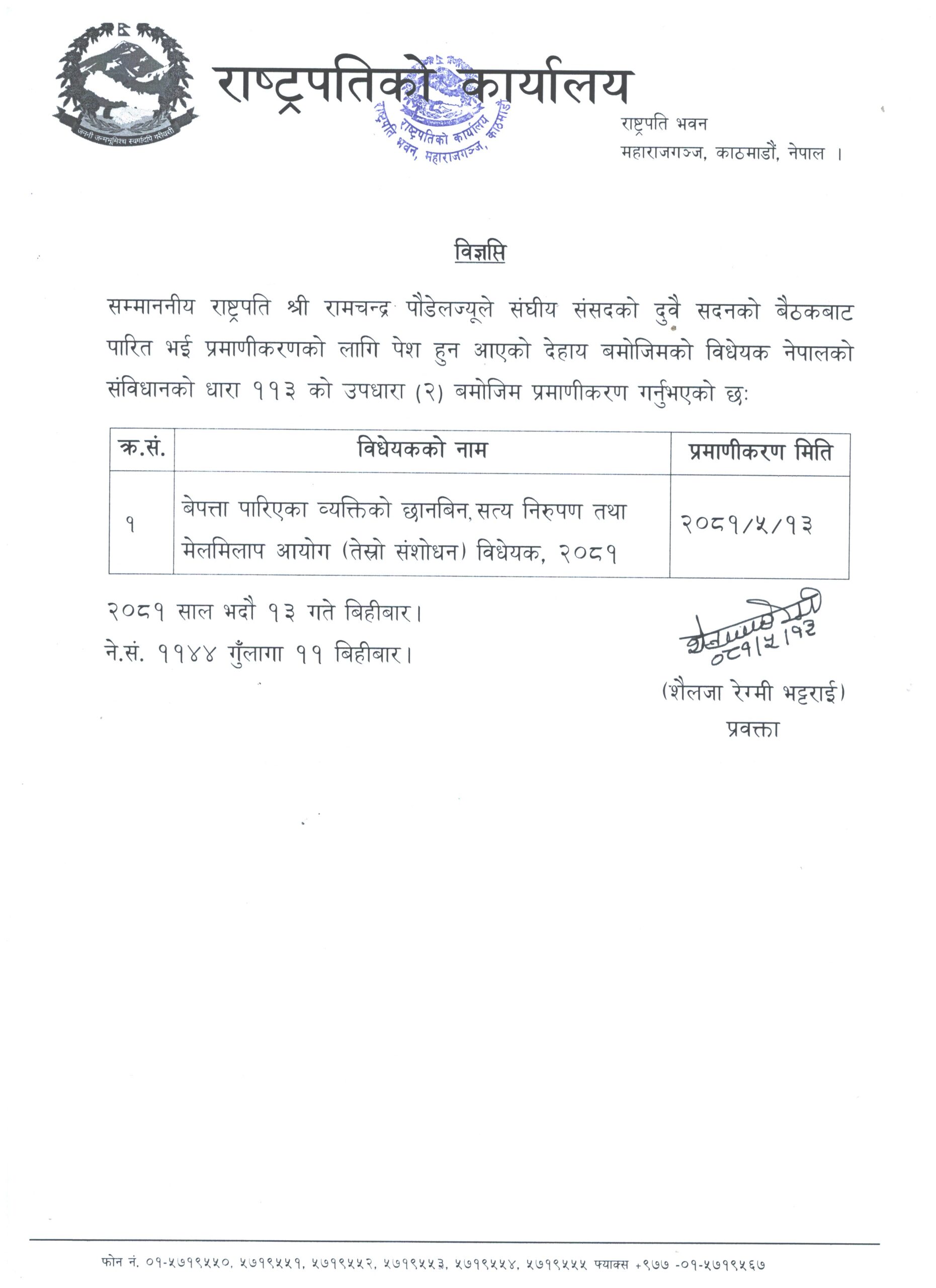 ‘‘राष्ट्रपति रामचन्द्र पौडेलले सङ्घीय संसद्को दुवै सदनको बैठकबाट पारित भई प्रमाणीकरणका लागि पेस हुन आएको देहाय बमोजिमको विधेयक नेपालको संविधानको धारा ११३ को उपधारा २ बमोजिम प्रमाणीकरण गर्नुभएको छ ।’’ प्रवक्ता भट्टराईद्वारा जारी विज्ञप्तिमा उल्लेख छ ।