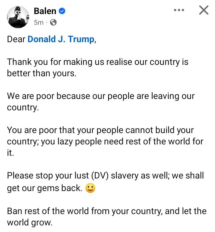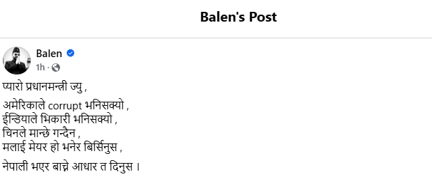 काठमाडौं महानगरपालिकाका मेयर बालेन्द्र शाहको स्टाटस / प्रधानमन्त्री केपी शर्मा ओली र अमेरिकी राष्ट्रपति प्रति कटाक्ष