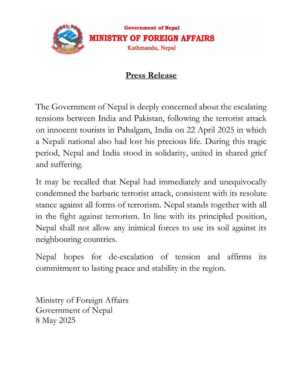 बिज्ञप्तिमा भनिएको छ- यस सन्दर्भमा स्मरणीय छ कि नेपालले उक्त बर्बर आतंकवादी आक्रमणको तत्काल र स्पष्टरुपमा भर्त्सना गरेको थियो, जुन आतंकवादका सबै प्रकारको विरोधमा नेपालको दृढ अडानसंग मेल खान्छ। नेपाल आतंकविरुद्धको लडाइँमा सबैसंगै उभिएको छ। आफ्नो सिद्धान्तमा आधारित अडान अनुसार नेपालले आफ्ना छिमेकी राष्ट्रविरुद्ध कुनै पनि दुस्मन शक्ति वा तत्वलाई आफ्नो भूमिको प्रयोग गर्न दिनेछैन । नेपालले तनावको न्यूनिकरण होस् भन्ने आशा राख्दछ।