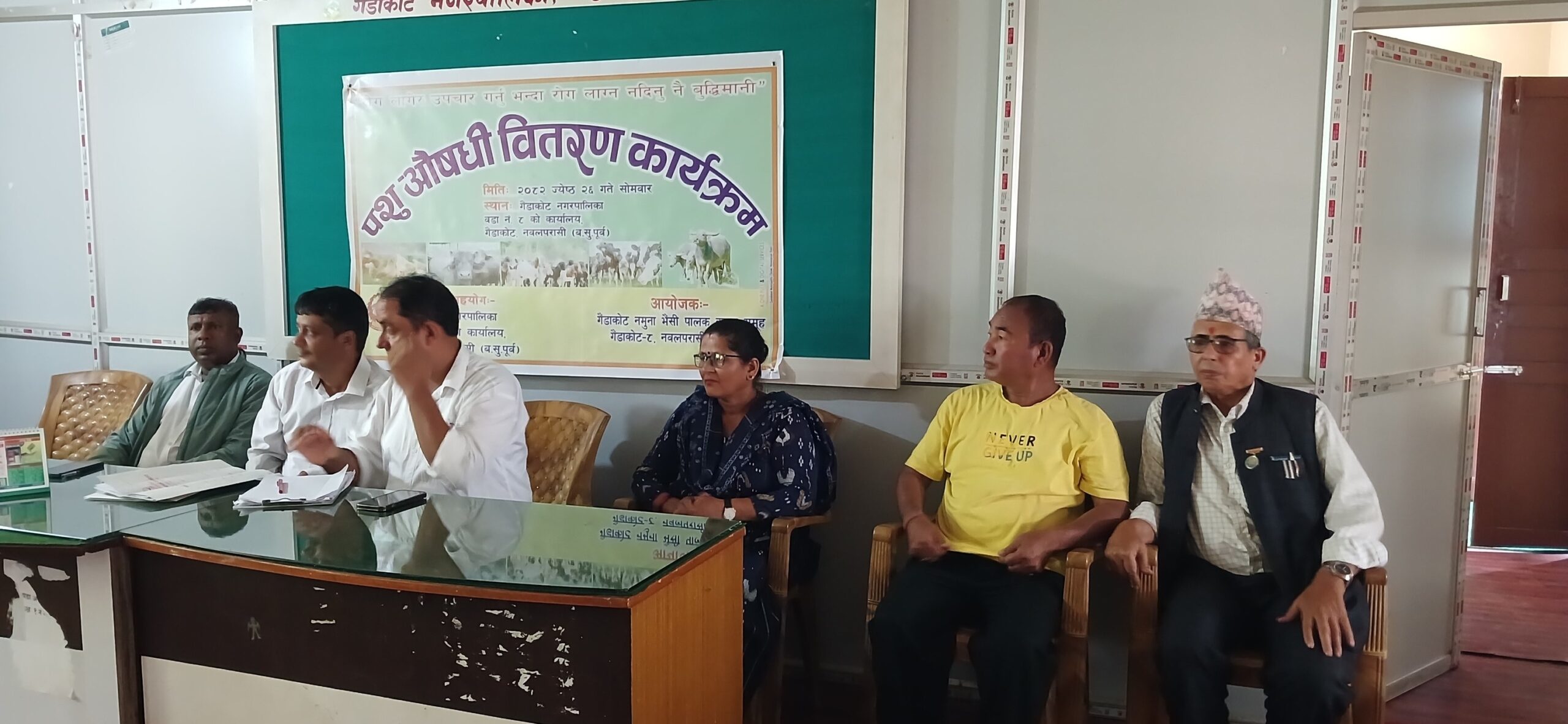 गैडाकोट नमुना भैसी पालक कृषक समुहका अध्यक्ष रामबन्धु पौडेलले पशु औषधि तथा भिटामिन सामग्रीका लागि वडामा रहेका मध्ये हाम्रो समुहमा आवद्ध भएका गाई भैंसीको संख्या ३७५ र बाख्राको संख्या १५० रहेको र व्यावसायिक रूपमा पशुपालन गर्ने कृषि फर्म ८ वटा रहेको बताउनुभयो। अध्यक्ष पौडेलले औषधिलाई प्रभावकारी ढंगले प्रयोग गरीदिनुहोला भन्दै औषधिलाई मात्रा मिलाएर खायो भने औषधि हुन्छ, मात्रा मिलाउन जानिएन भने विष हुन्छ। त्यसैले जानेर मात्र खुवाउनु होला ,नजानेको खण्डमा पशु चिकित्सकलाई सोध्न आग्रह गर्नुभयो।