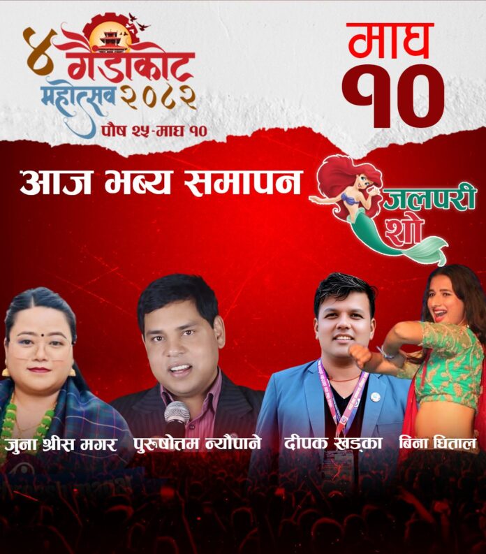 माघ १०,गैँडाकोट । नवलपुरको गैँडाकोट–२ स्थित नारायणी नदी किनारमा जारी चौथो गैँडाकोट महोत्सव आज समापन हुँदैछ । आज समापनको दिन महोत्सवमा चर्चित लोक तथा दोहोरी गायक पुरुषोत्तम न्यौपानेसहितका कलाकार आउने भएका छन् ।