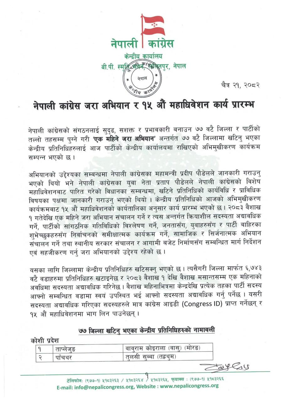 सङ्गठनलाई सुदृढ, सशक्त र प्रभावकारी बनाउन नेपाली कांग्रेसले जरा अभियानको घोषणा
