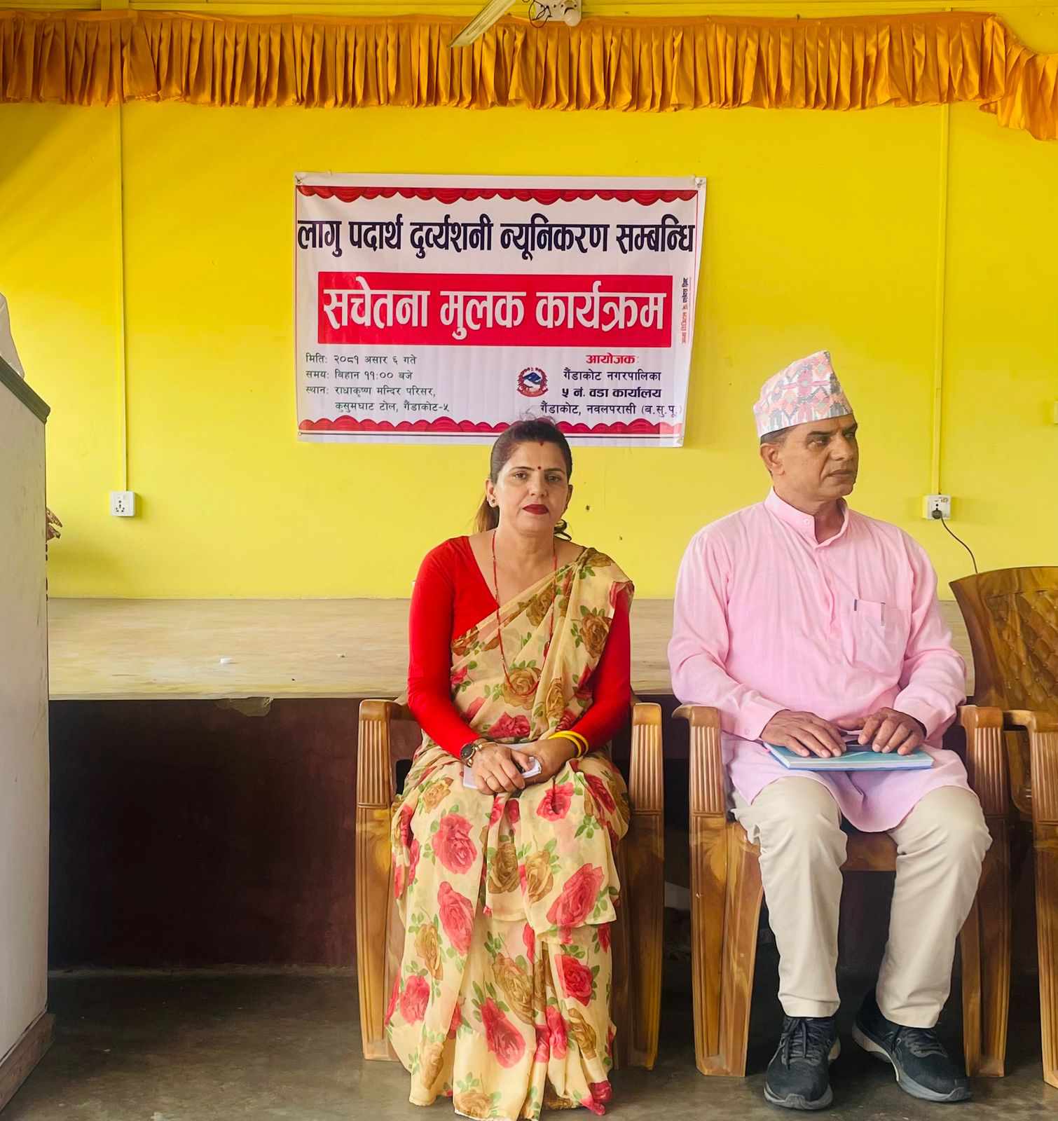 बिहिबार गैडाकोटको राधाकृष्ण मन्दिरमा गैंडाकोट ५ को आयोजनामा कार्यक्रम सम्पन्न भएको हो। कार्यक्रममा बोल्दै प्रमुख अतिथि गैंडाकोट ५ का वडा अध्यक्ष रत्नप्रसाद सापकोटाले वडालाई लागूऔषध मुक्त बनाउन यस्तो किसिमको कार्यक्रमले टेवा पुग्ने बताउनुभयो । उहाँले जनचेतना फैलाउँदै लैजाने हो भने अवश्य पनि लागू औषध न्यूनीकरण हुने बताउनु भयो ।